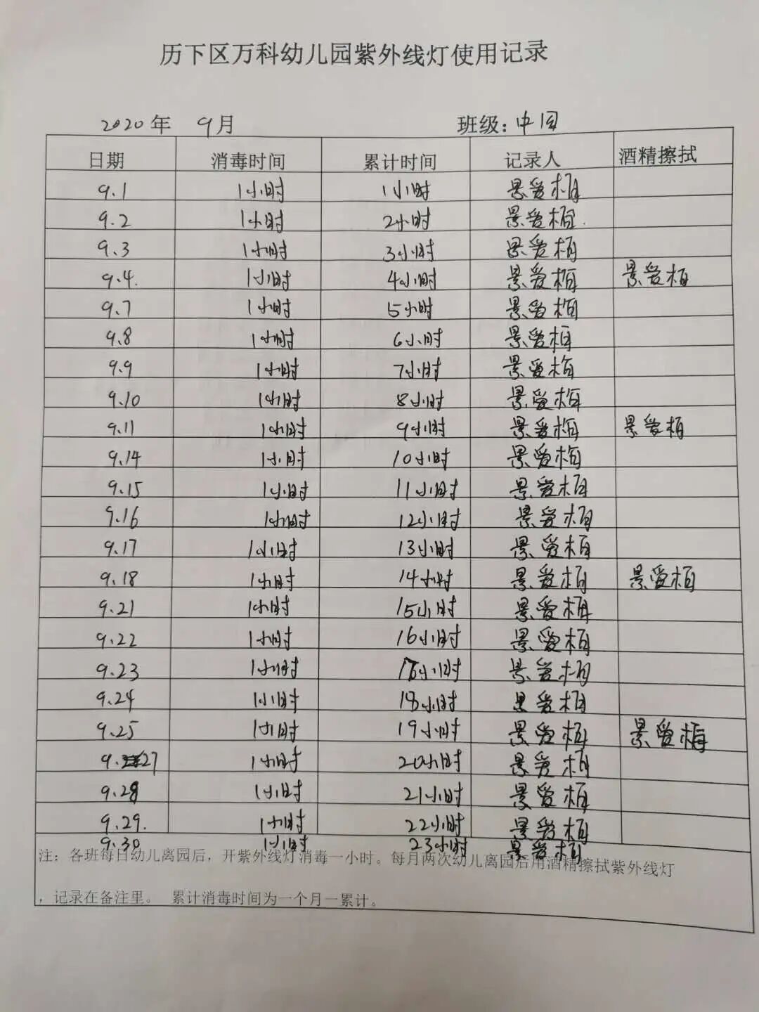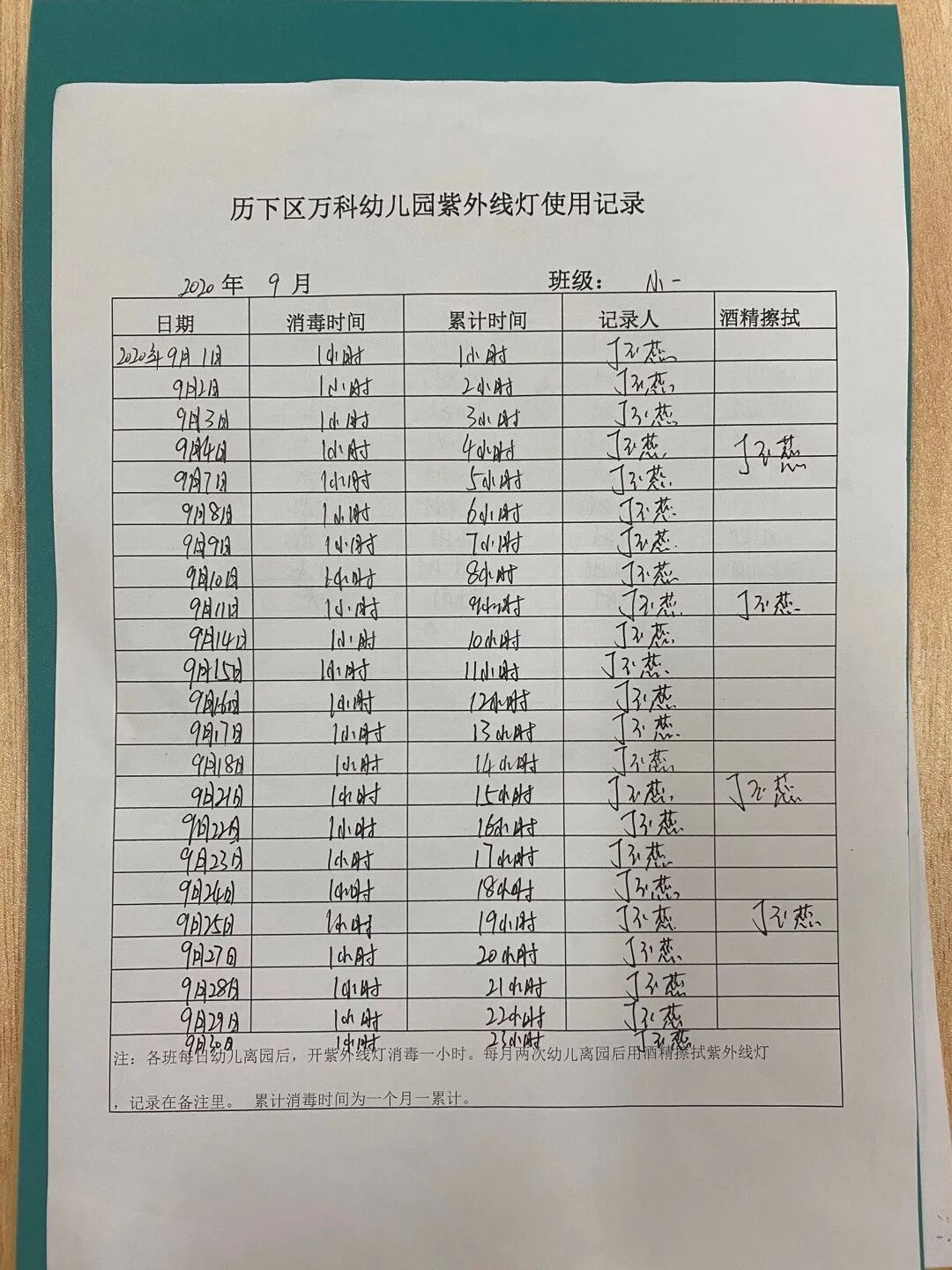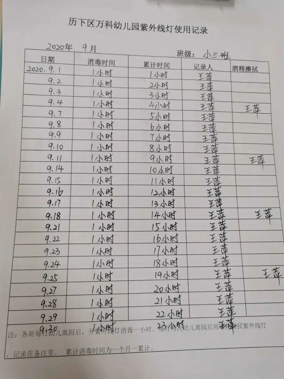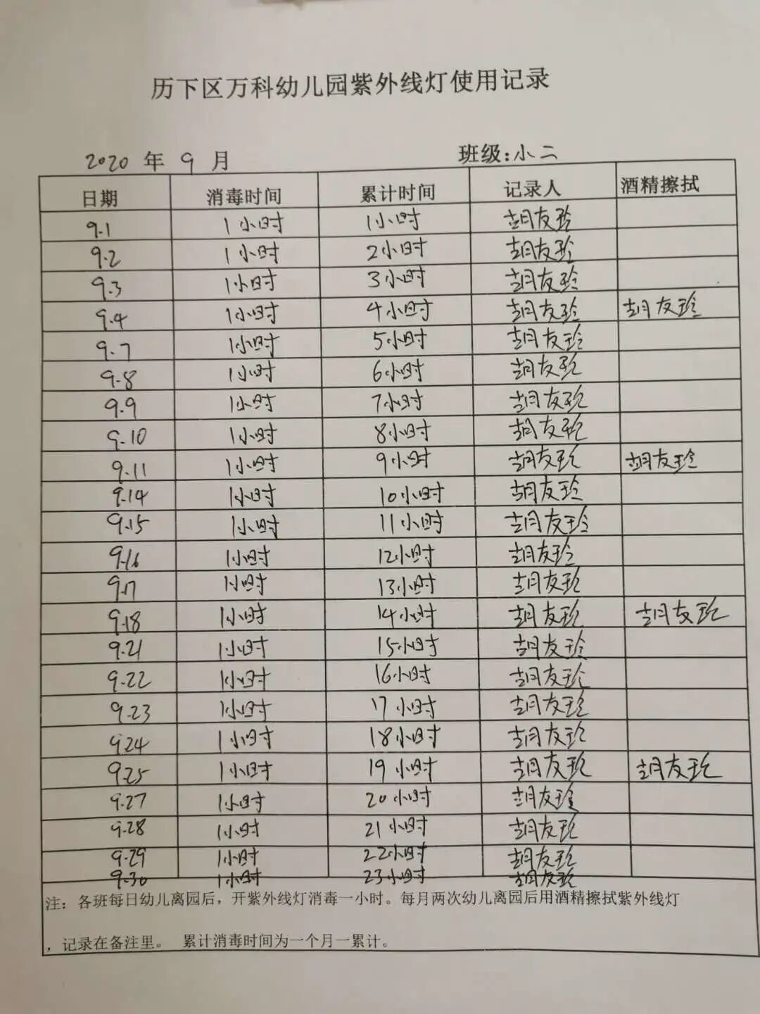 我园建立了规范的紫外线消毒灯操作制度、管理制度和应急预案。紫外线消毒灯由专人管理、使用并做好登记。建立紫外线使用记录台账,记录每支紫外线灯开始使用日期、每次消毒时间、累计消毒时间、消毒人员姓名。