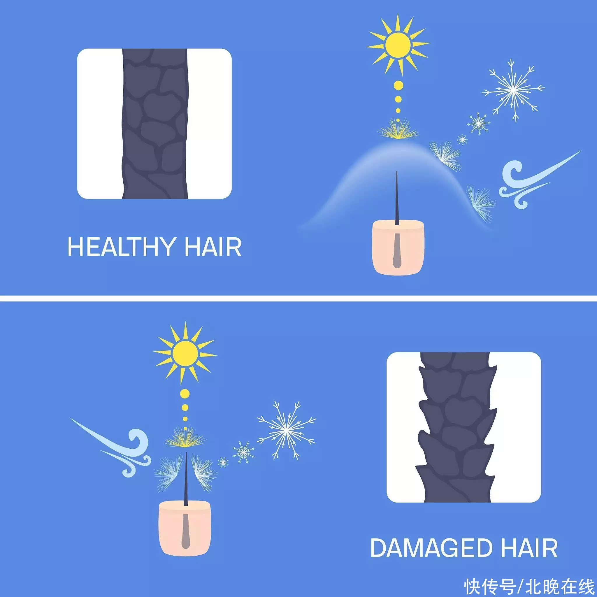 对于暴露在皮肤外的毛干,紫外线引起的变化包括物理和化学两方面。其中,物理变化包括头发干枯毛躁、颜色减退、光泽和硬度下降、脆性增加等;化学变化包括头发的蛋白质、脂质和色素改变。