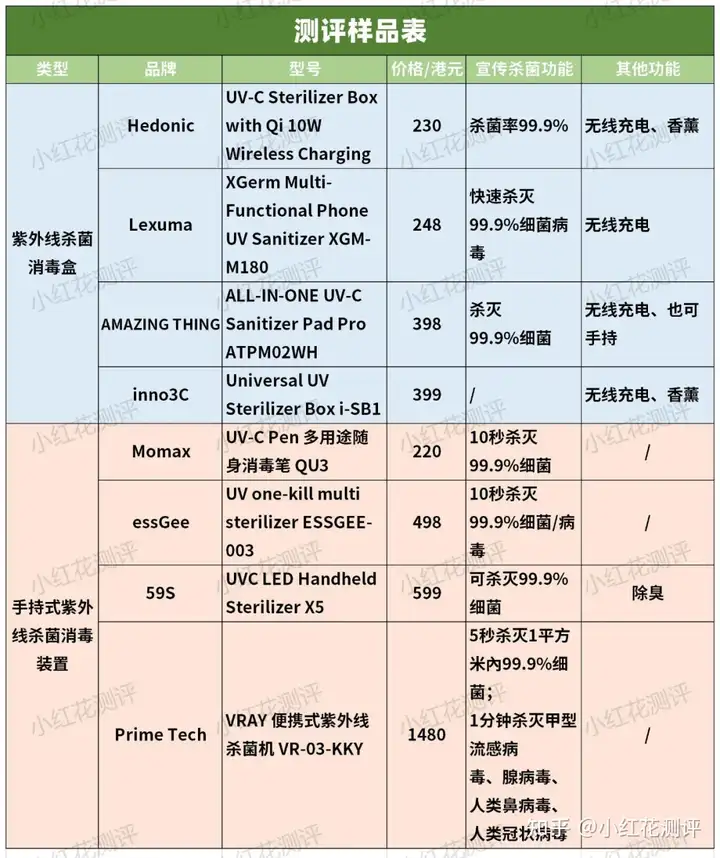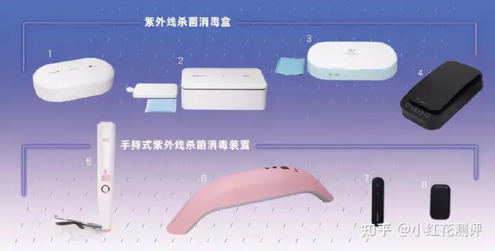 本次测评样品,均为便携式紫外线杀菌消毒器,包括4款消毒盒、4款手持式消毒器。