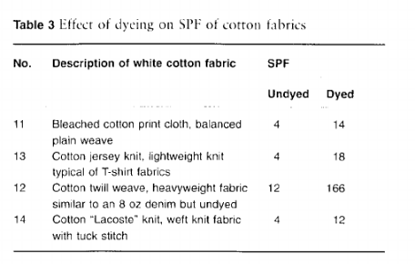 从这个研究的测试结果我们可以看到,薄白色衣物的防晒指数 SPF 只有 4,厚的白色为 12;薄的染色棉布为 12-18。参考防晒霜的 SPF30 以上为标准,只有厚的染色棉布能实现。