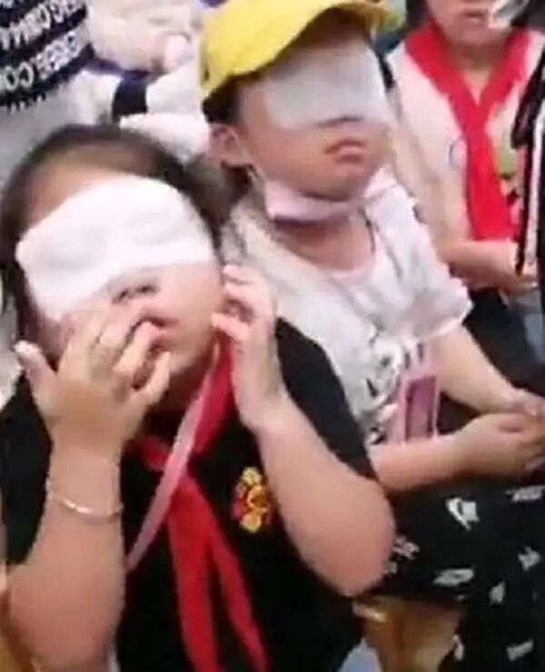 这是那些受伤的孩子在冷敷眼睛。看着就揪心……