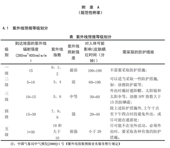 又根据中国气象局中气预发[2000]11号,《紫外线指数预报业务服务暂行规定》,紫外线指数和紫外辐射强度之间的对应关系如下表二所示: