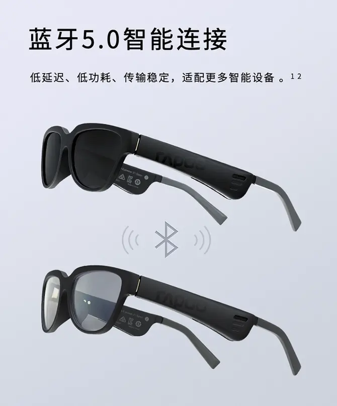 另外这款智能眼镜采用了蓝牙5.0技术,能够实现稳定的链接,经过我们的实际测试,眼镜的无障碍有效链接距离达到10米,同时延迟非常低,在使用的过程中基本没有出现断连和延迟的情况,使用体验优秀,同时蓝牙5.0技术,让这款眼镜适配更多的智能设备,兼容性非常出色。