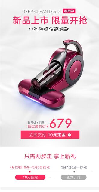 春夏季节螨虫肆虐,是过敏、哮喘等症状的高发期,外出活动后除了勤洗澡也别忘了给自己家中的床褥做一次深度清洁。近日,小狗吸尘器推出首款负离子高端除螨仪D-615,玛瑙红配色时尚小巧,颇有春天的气息。即日起至5月6日23时,小狗D-615除螨仪将在天猫小狗蓝弧专卖店开启10元预定活动,享9重优惠。首发不仅立省120元,还有机会额外再赢取小狗D-615一台。成功预定且于5月7日支付尾款的前500名用户还送德国进口EMSA保温壶,最终成交价仅679元。