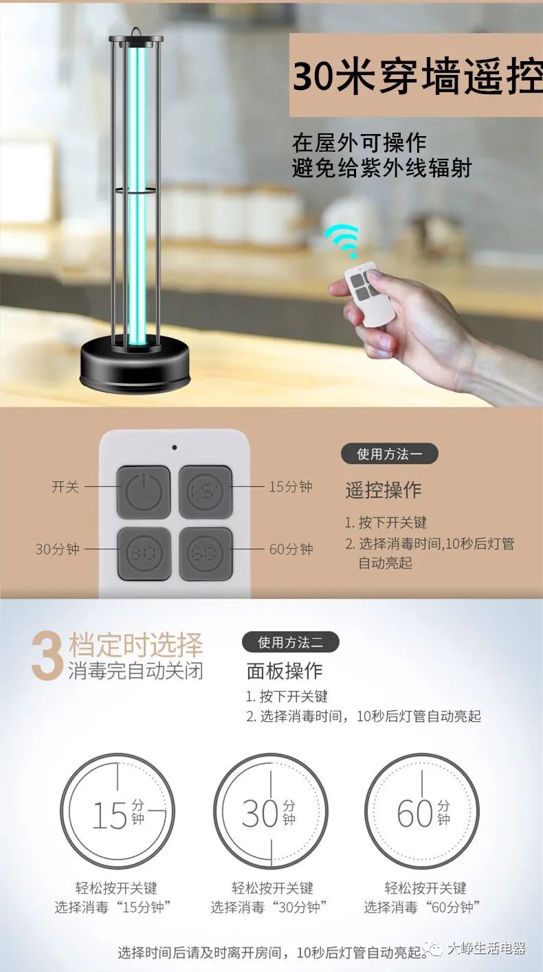 如果家里有老人或病人行动不便,担心开启时的10秒延迟不足以全身而退,还可以使用消毒灯遥控器,可以隔墙遥控开关,不影响信号发送效果。