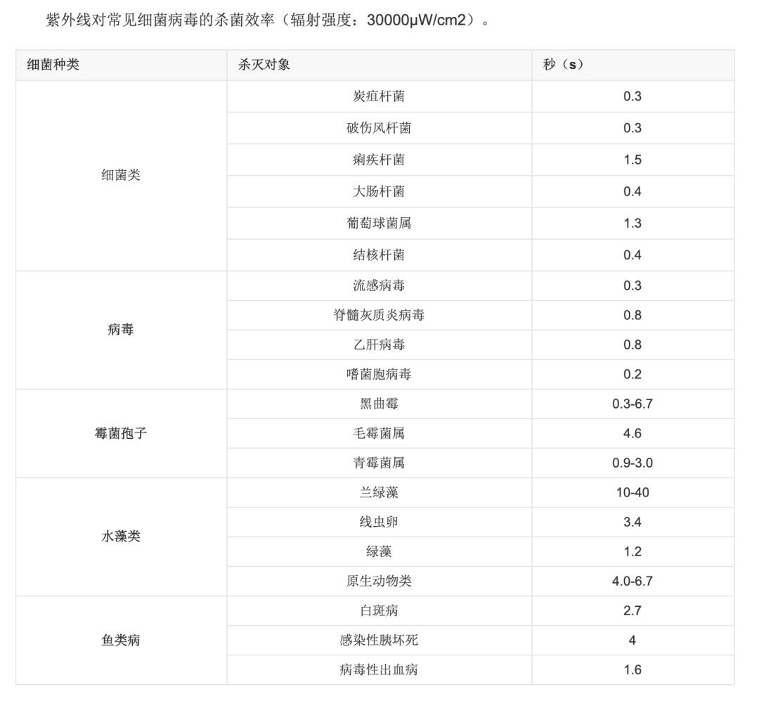 我们来看看紫外线杀灭各种微生物的效率有多高(图片来源:百度百科)——