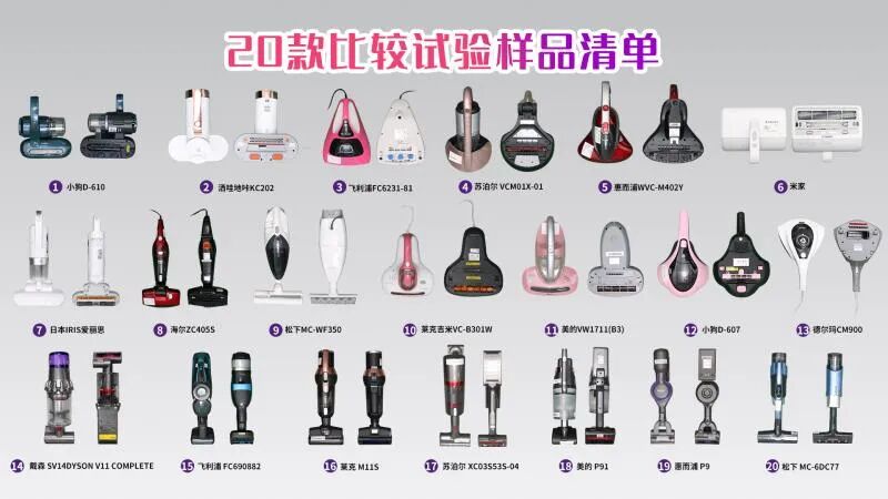 进行比较试验的样品共计20款,价格159—4990元不等,均宣传具有除螨功能。其中标称为除螨仪类的样品为13台,带有除螨吸头的手持吸尘器类样品7台。样品品牌涉及美的、小狗、戴森、德尔玛、莱克、米家、海尔、苏泊尔、松下、莱克吉米、飞利浦、惠而浦、爱丽丝、洒哇地咔等14个品牌。