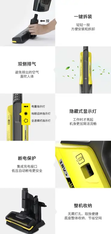 精巧的产品设计也是卡赫VC4i无线吸尘器值得说道的地方。配件拆装及其方便;排气孔设计在机身两侧,避免直接吹脸;隐藏式的显示灯只有在工作时才会亮起,整个机身更简洁;充电接口断电保护,安全性更强;底座不仅能够直立收纳VC4i无线吸尘器,使其不占地方,更设计有收纳孔,可以收纳常用配件。