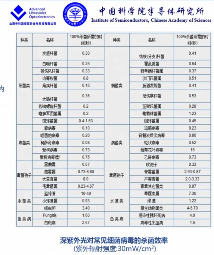 可以参考下图,对于紫外线杀菌的细菌种类以及时长,(下图适用范围为UVA深紫外线杀菌效果)