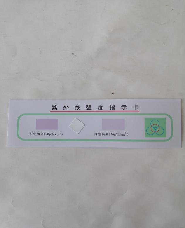 使用方法:测定时,打开紫外线灯管5分钟待其稳定后,将指示卡置于距紫外线灯管下方垂直1米中央处,将有图案的一面朝向灯管,照射1分钟。受到规定波长的紫外线照射后,卡片纸中央的紫外线光敏色块由乳白色变成不同程度的淡紫色。将其与标准色块相比,即可测知紫外线灯辐照强度值是否达到使用要求。