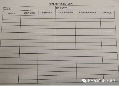 室内悬吊式灯管安装数量(30W灯管,在垂直1m处辐射强度高于70μW/cm2)为平均每立方米不少于1.5W,并且要求分布均匀、吊装高度距离地面1.8~2.2m,使得人的呼吸带处于有效照射范围。连续照射30-60分钟,不宜悬挂太高,会影响灭菌效果。紫外线灯消毒记录表参照如下: