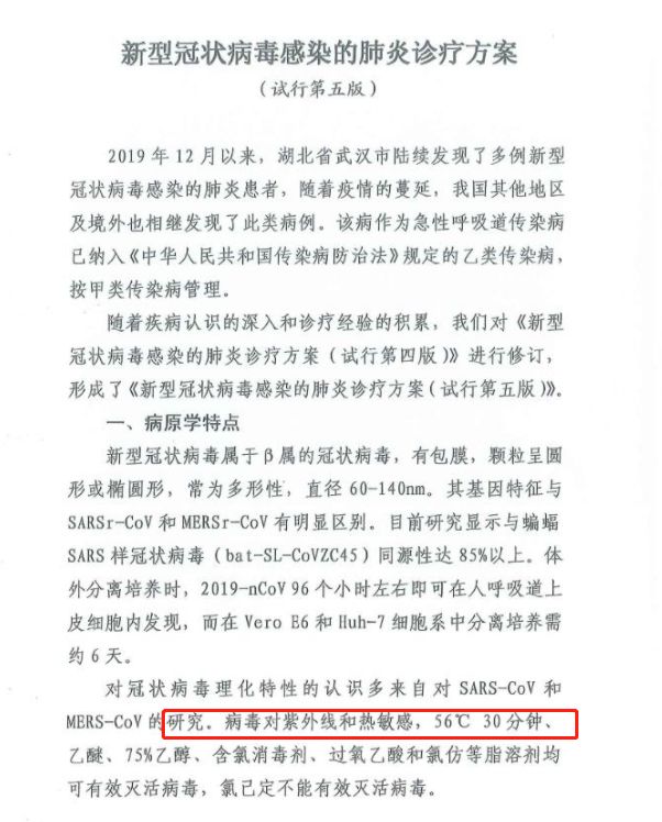紫外线可以破坏病毒的结构从而杀死病毒这是大家都知道的,03年的非典消失的原因很大一部分是因为气温升高,紫外线变强杀死了毒病,从源头上抑制了病毒的传播。而在今年国家卫健委和国家中医药管理公布的《新型冠状病毒感染的肺炎诊疗方案》描述了病毒对紫外线和热敏感。