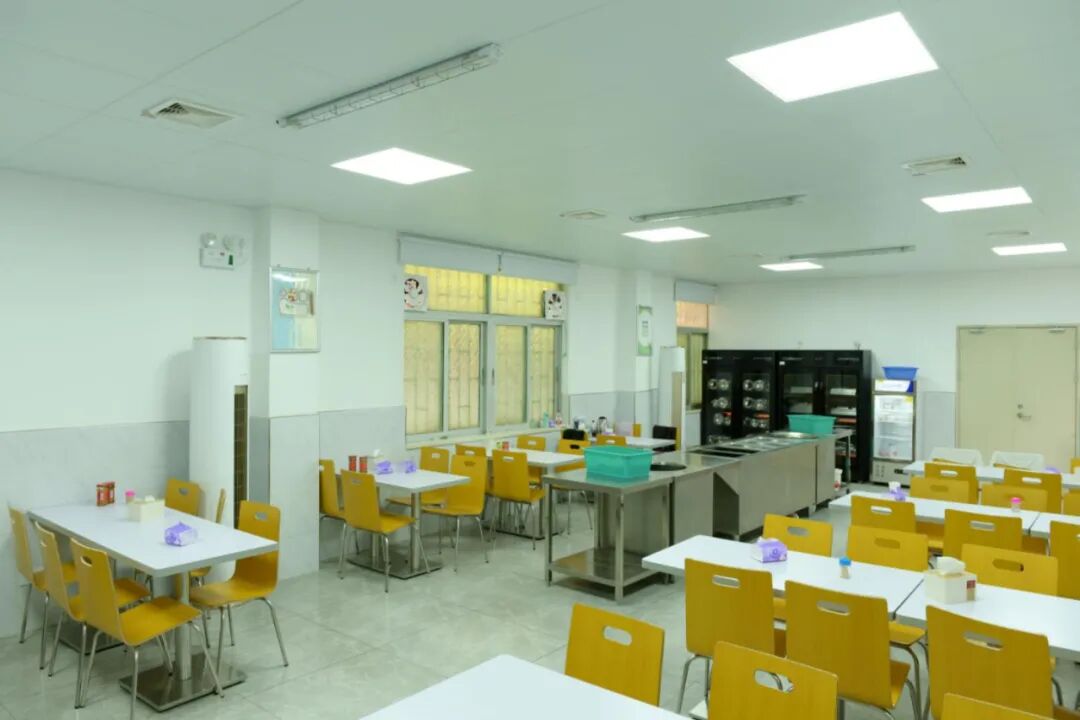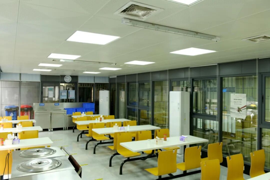 党群中心人员集中区域,就餐大厅采用了冠科GKU12+L32控制系统,该方案为中国首家获得直照式消毒灯UL安全认证,含有四重智能安全防护设计。