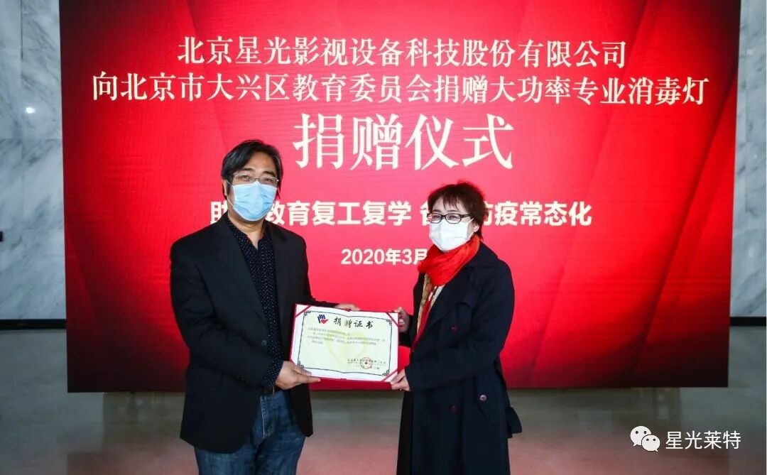 助力教育复工复学,备战防疫常态化,星光向北京大兴区教委捐赠大功率专业消毒灯100套。