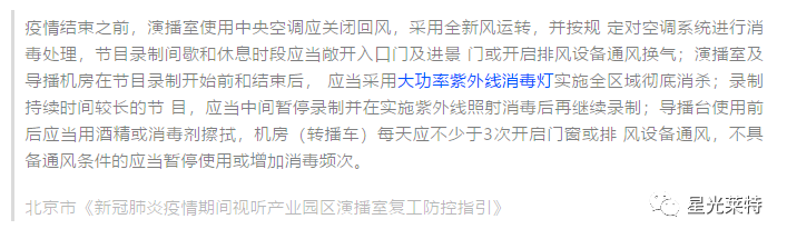 广电发布复工指引文件3月22日,北京市广播电视局联合北京市疾控中心发布了《新冠肺炎疫情期间视听产业园区演播室复工防控指引》,指引中建议使用大功率专业消毒灯。