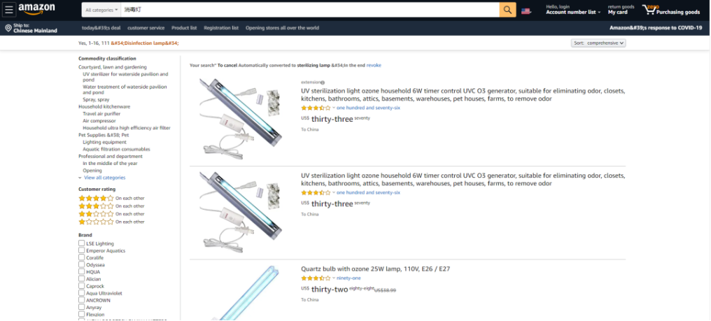北美站国内最近有大量卖家是UV紫外线消毒灯/棒被亚马逊下架,特朗普告诉EPA(美国环境保护署)新冠病毒要“看紧看紧”中国来的消毒产品,于是EPA通知亚马逊多观察观察来自中国的消毒产品。
