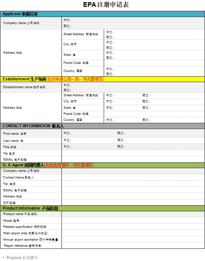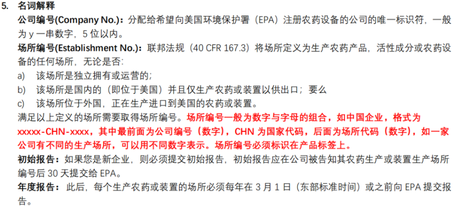 EPA必须以工厂申请,一定要有实际生产地址以便EPA核查,贸易商申请需要和工厂协商好利益关系。EPA不会发放证书,注册成功后EPA官网可以直接查询,标签上一定印刷5位场所编号XXXXX-CHN(国家代码)-XXXX(自行设定产品内部编号) ,新申请需要提交初审报告以及每年的年度报告,详见后文。