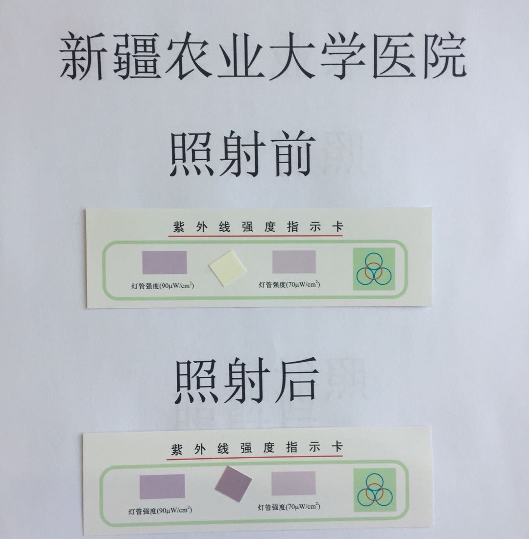 测定时,打开紫外线灯管5分钟后,将指示卡置于距紫外线灯管下方垂直1m中央处,将有图案一面朝向灯管,照射1分钟后,图案中的紫外线光敏色块有乳白色变成不同程度的淡紫色,将其与标准色块对比,即可测知紫外线灯辐照强度值是否达到使用要求。